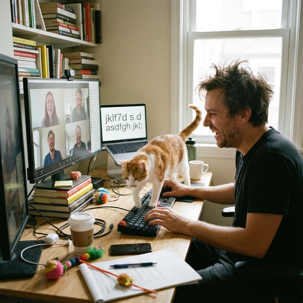 Nous l'avons tous vécu. Vous êtes en pleine présentation sérieuse sur les chiffres du trimestre. Soudain, une queue apparait à l'écran. Puis un anus. * La stratégie de crise : Ne paniquez pas. N'essayez pas de le chasser violemment, ce qui résulterait en un combat bruyant et gênant. * L'acceptation : Présentez-le. "Je vous présente Michel, notre consultant externe en sieste stratégique." L'humour désamorce la situation. La plupart des gens aiment voir un chat à l'écran, cela humanise la réunion.