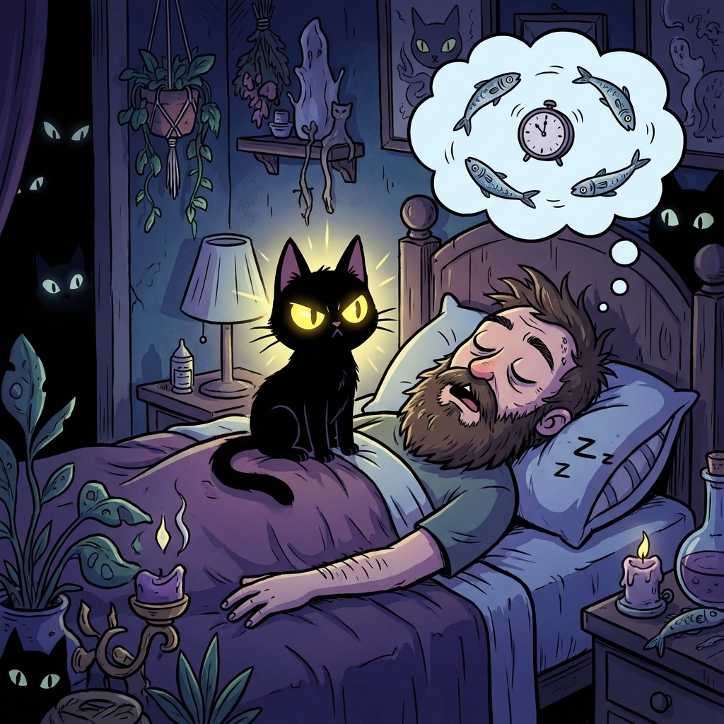 Il vous fixe pour guetter le moindre signe de réveil. * Si vous bougez -> Il miaule. * Si vous ne bougez pas -> Il s'assoit sur votre poitrine et vous fixe jusqu'à ce que le malaise vous réveille. C'est une guerre d'usure psychologique, et il sait qu'il va gagner.