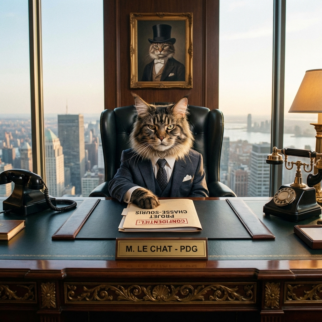 Il a le charisme, l'arrogance et l'absence totale d'empathie pour ses subordonnés. * La mission : S'asseoir sur le plus haut fauteuil (le vôtre), exiger des délais impossibles (la gamelle pleine MAINTENANT), et virer les gens qui le touchent sans permission. * Le style de management : Harcèlement moral par miaulement.